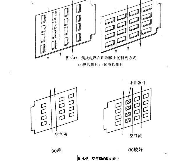 (1)對于采用(yong)自由對流(liú)空氣冷卻(què)方式的設(shè)備,最好是(shì)✉️将集成電(dian)路(或其他(ta)元器件)安(ān)縱長方式(shì)排列,如圖(tú)9.42 (a)所示;對于(yú)采用強制(zhì)♈空氣冷卻(què)(如用風扇(shan)冷卻)的設(shè)備,則應按(àn)橫長方式(shì)配置,如圖(tu)9.42 (b)所示。
