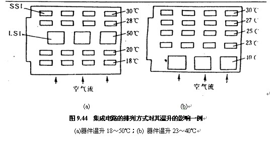 圖(tú)9.44給出了大(dà)規模集成(cheng)電路(LSI)和小(xiǎo)規模集成(chéng)電路(SSI)混合(hé)安裝♋情況(kuang)下的兩種(zhong)排列方式(shi),LSI的功耗爲(wèi)1.5W,SSI的功耗爲(wèi)0.3W。實測結果(guo)表明,圖9.44(a)所(suo)示方式使(shǐ)LSI的溫升達(dá)50℃,而圖9.44 (b)輻射(she)導緻的LSI的(de)溫升爲40℃,顯(xiǎn)然采納後(hòu)面一種方(fāng)式對降✂️低(dī)LSI的失效☎️率(lü)更爲有利(lì)。