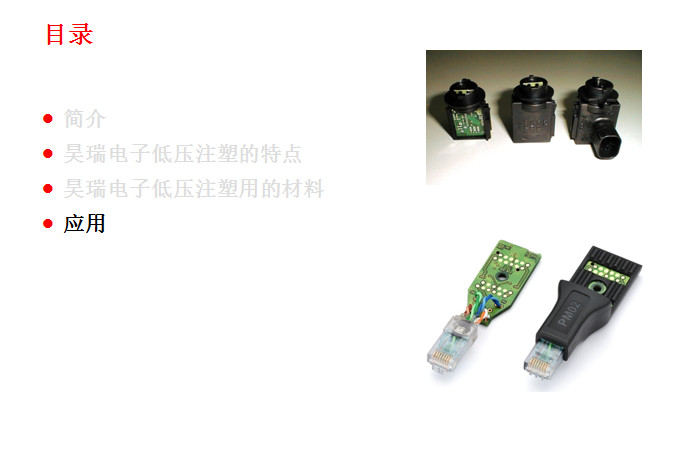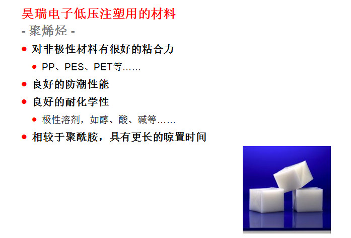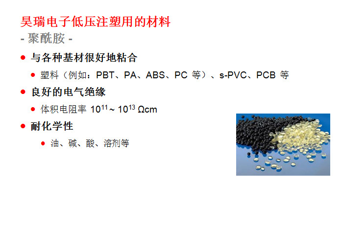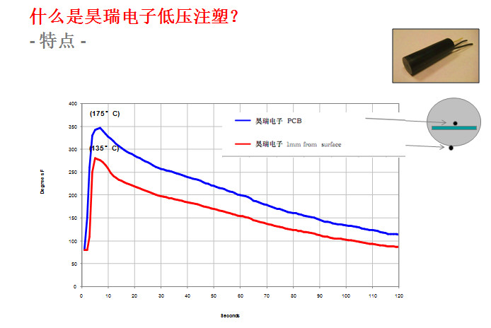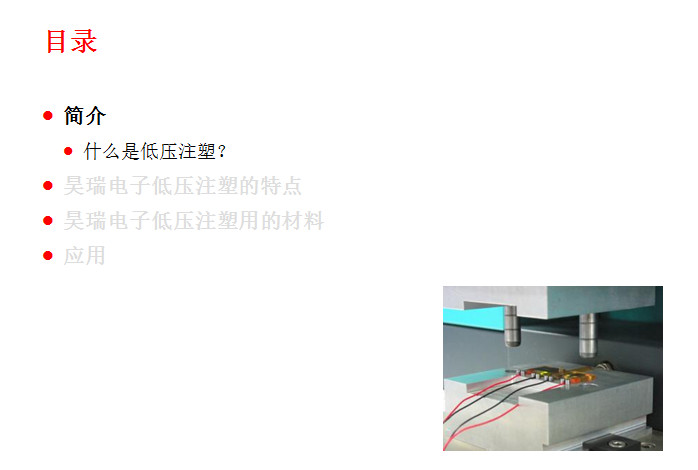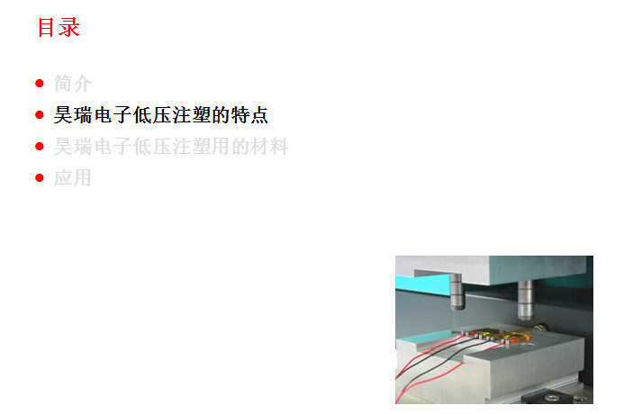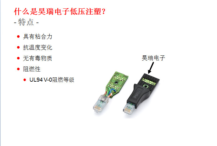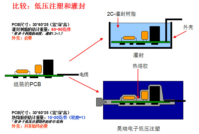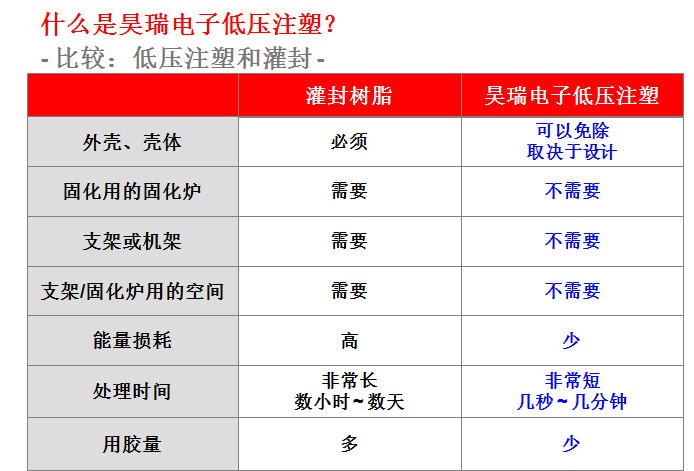 低壓(ya)注塑(注射)成型(xíng)工藝是一種使(shi)用很小的注射(she)壓🌈力(1.5~40bar)将封裝材(cai)料注入模具并(bìng)快速固化成型(xíng)(5~50秒)的💔封裝工藝(yi)方法,以達到絕(jue)緣、耐溫、抗沖擊(jī)、減振、防潮🔞、防水(shuǐ)、防塵、耐化學腐(fǔ)蝕等等功效 。