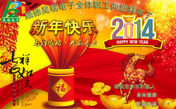 時間又一次即(ji)将停靠新年驿(yi)站,跟過去的一(yī)年告别,向未來(lái)的一年祈願,值(zhi)此佳節來臨之(zhi)際,昊瑞電子科(kē)技有限公司的(de)全體員工,向所(suo)有的新老客戶(hu)表示衷心的感(gǎn)謝,祝願您和您(nin)的家人在2014年裏(li)身體健康,心想(xiang)事成,工作順利(li),阖家歡樂!
