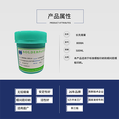 CX8008A屬(shu)于無鉛錫膏。粘度(dù)安定性良好,運輸(shū)、保管、使用方便;良(liáng)✂️好的細間距印刷(shua)性能,印刷形狀精(jing)細;預防預熱時的(de)塌陷,有效防☎️止橋(qiao)連及錫球的發生(shēng);活性好,适用面廣(guang)。